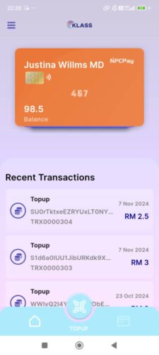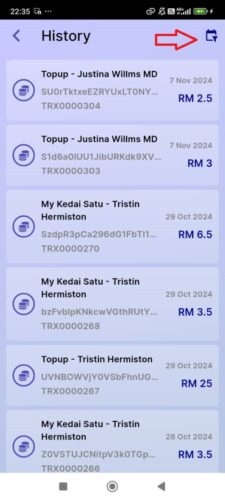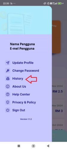 Untuk lihat kesemua rekod perbelanjaan setiap kad NFC yang ditambah boleh ke ‘side’menu’ dah klik pada “History”